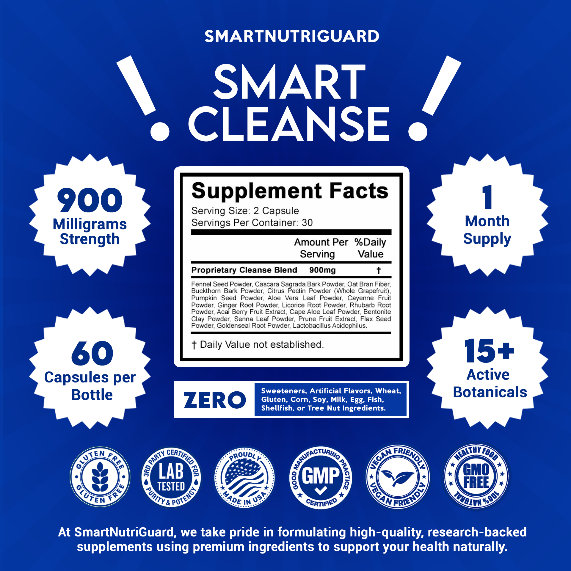 Reset your digestive system and reclaim your vitality with SmartNutriGuard Smart Cleanse—a premium detox and digestive support formula crafted with a powerful blend of natural herbs and fibers.